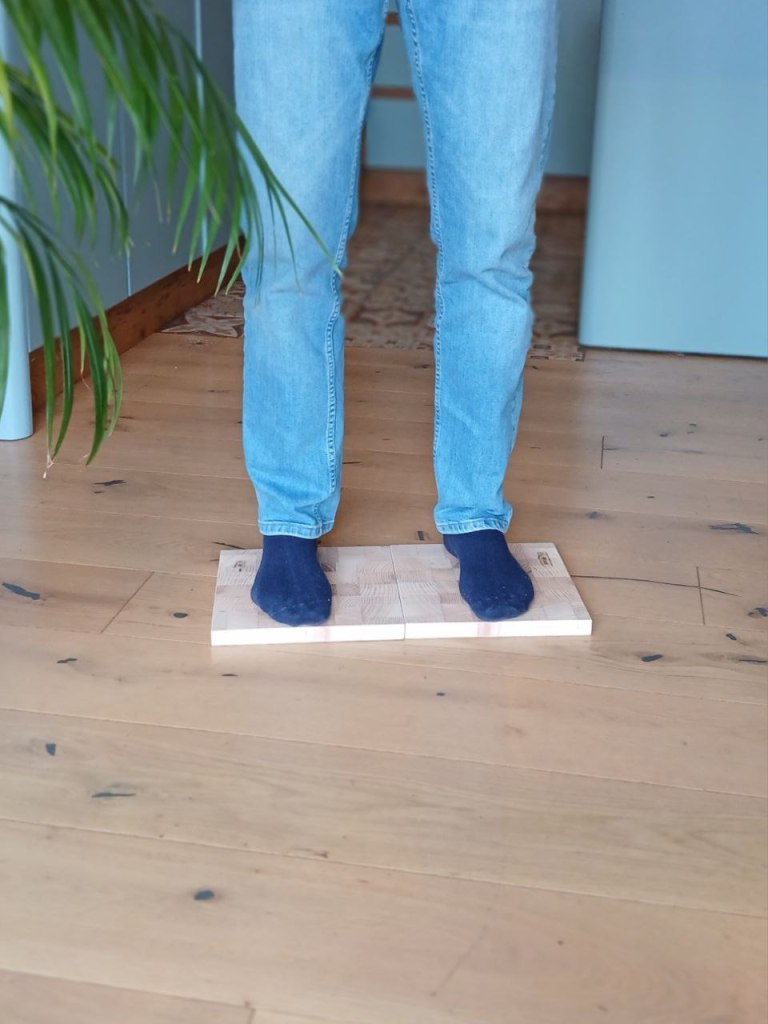 Les deux pieds placés sur les tablettes avec la partie – sous la voute plantaire.